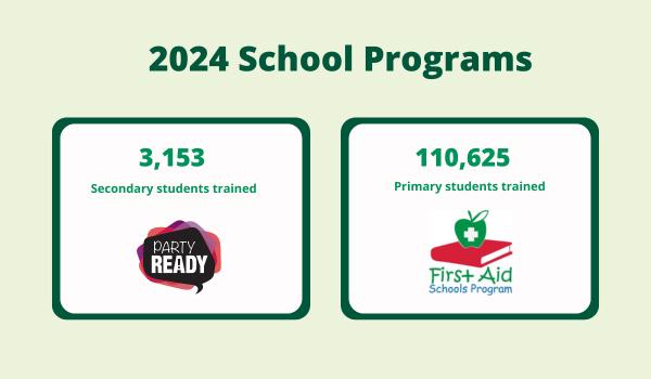 In 2024, we trained 110,625 primary school students in first aid, our biggest year in five years. Delivered to 451 schools, the program continues to be highly rated by teachers (9.6/10) and eagerly anticipated by students.